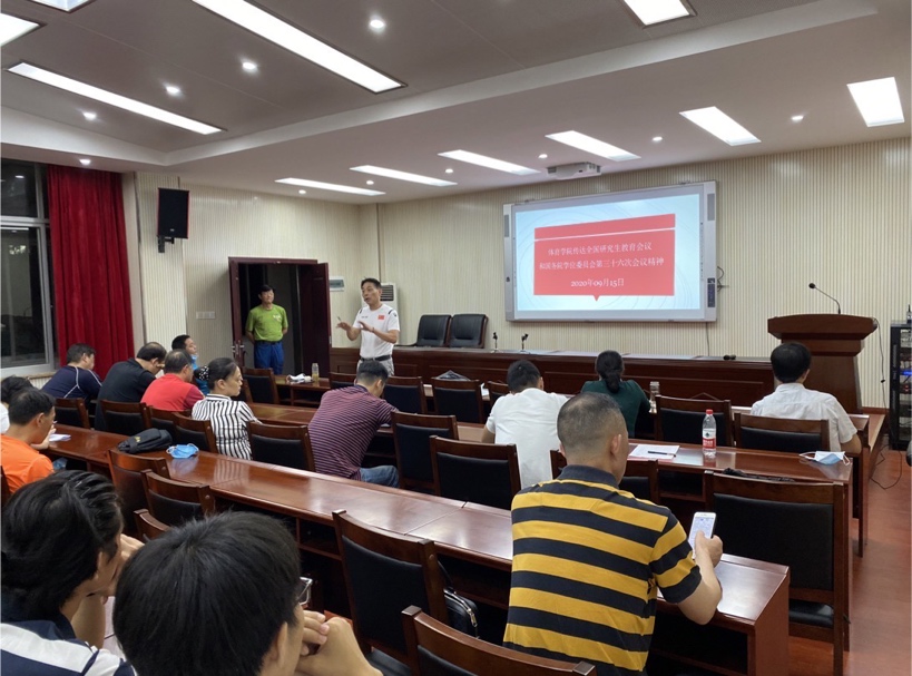 会议的第二项是传达了2020年7月举行全国研究生教育会议和国务院学位委员会第三十六次会议基本情况,杨汉副院长带领全体师生重点学习了习近平总书记关于研究生教育工作的重要指示精神,李克强总理的重要批示,学习了孙春兰副总理关于扎实做好研究生教育五方面的重点工作要求,和教育部长陈宝生关于研究生教育围绕“内涵建设”和“质量提升”过五关举措等重要会议精神。