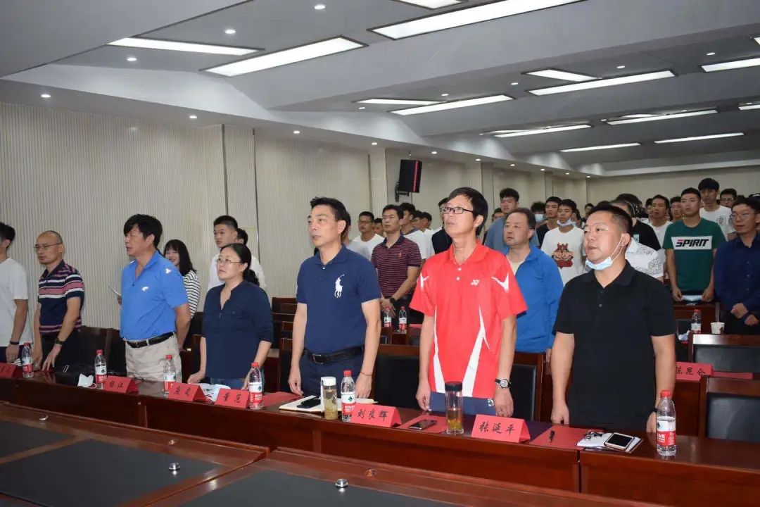在介绍完参会的各位老师后,现场全体师生起立,一同奏唱国歌。