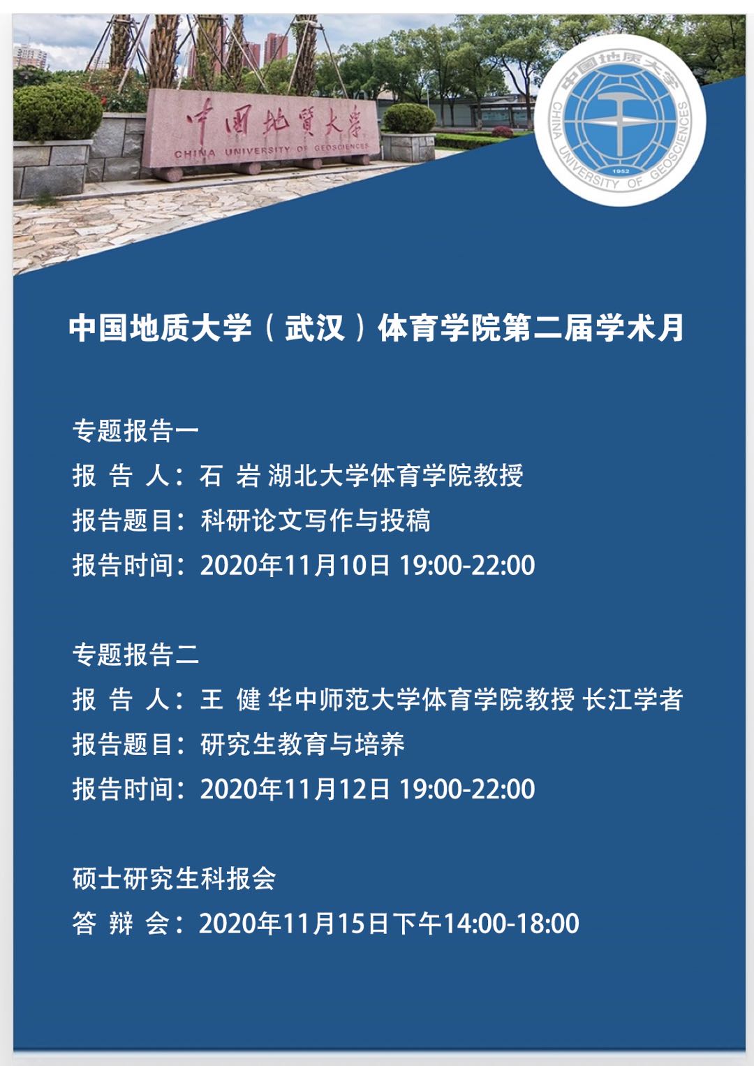 (通讯员:黄思洁、张毅恒)为深入学习贯彻习近平总书记对研究生教育工作的重要指示和全国研究生教育会议精神,深入贯彻落实党的十九大以来有关研究生教育工作的部署,全面贯彻党的教育方针,落实立德树人根本任务,以提升研究生教育质量为核心,活跃污漫画 科技活动氛围,培养和锻炼研究生的科学研究素养和能力,污漫画 于2020年11月举办了第二届学术月。活动邀请了湖北大学污漫画 教授、博士生导师石岩和华中师范大学污漫画 教授、博士生导师、长江学者王健分别进行了专题报告,并于2020年11月15日下午举办了研究生科技论文报告会。