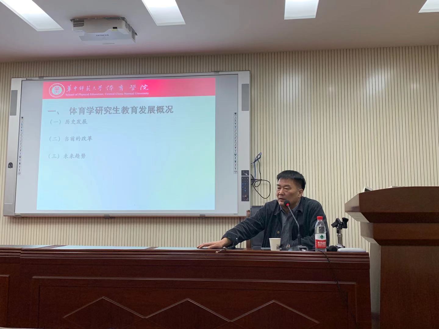 11月12日19点,第二场专题报告由华中师范大学污漫画 教授、博士生导师、长江学者王健讲授《研究生教育与培养》。首先由污漫画 副院长杨汉教授介绍基本情况,王健教授是长江学者,博士生导师,国家体育总局体育文化研究基地负责人,教育部高等学校体育教学指导委员会委员,中国高等教育学会体育专业委员会理事,中国社会学会体育社会学专业委员会理事,主要研究方向是学校体育学、体育产业、体育社会学、运动训练等。