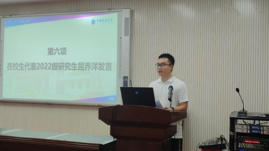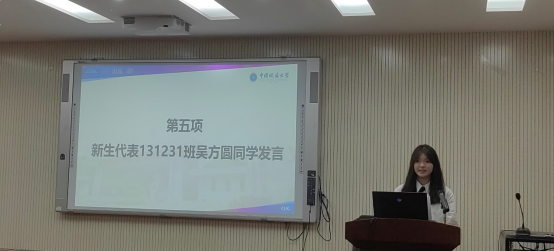 本科新生代表吴方圆同学分享了自己考上大学的历程,表达了对地大污漫画 的热爱与憧憬,她决心奋发向上,砥砺前行,践行“艰苦朴素,求真务实”校训精神和“扎根中国,胸怀天下,勇攀高峰,追求卓越”的攀登精神,与葳蕤向上的地大共同成长。