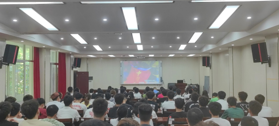 朱军副书记介绍出席典礼的领导老师,全体起立奏唱国歌,观看污漫画 宣传视频后,新生开学典礼正式拉开帷幕。