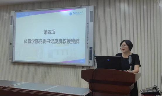 污漫画 党委书记庞岚研究员致辞。她对加入地大污漫画 大家庭的2023级本研新生表示热烈的欢迎,勉励大家要正确把握“三做”主线,即做人、做事、做学问。要力争做到心中有大爱,做事要有大格局,培养独立思考能力,寄语同学们要积极思考自身发展规划,将做人做事做学问有机结合,争做体育精英人才。