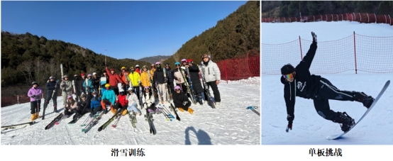 滑雪训练场上,同样是一片热火朝天的景象。在何鹏飞老师的教导下,大家从初级雪道的蹒跚学步,到中级雪道的风驰电掣,同学们不断突破自己的极限。一次次摔倒,一次次又爬起,他们的技术逐渐娴熟,对滑雪的热爱也愈发深厚,甚至后面有几个大胆的同学已经开始尝试单板。在滑行过程中,同学们感受着风的呼啸,享受着速度带来的激情,冰雪仿佛成为了他们与自然对话的媒介。