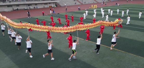 校舞龙队的9名学生高举威武的“龙”,友情加入到表演队伍。金色的长龙盘旋飞舞,时而飞上天空,时而在地面盘旋,引起在西区操场锻炼的师生连连叫好。